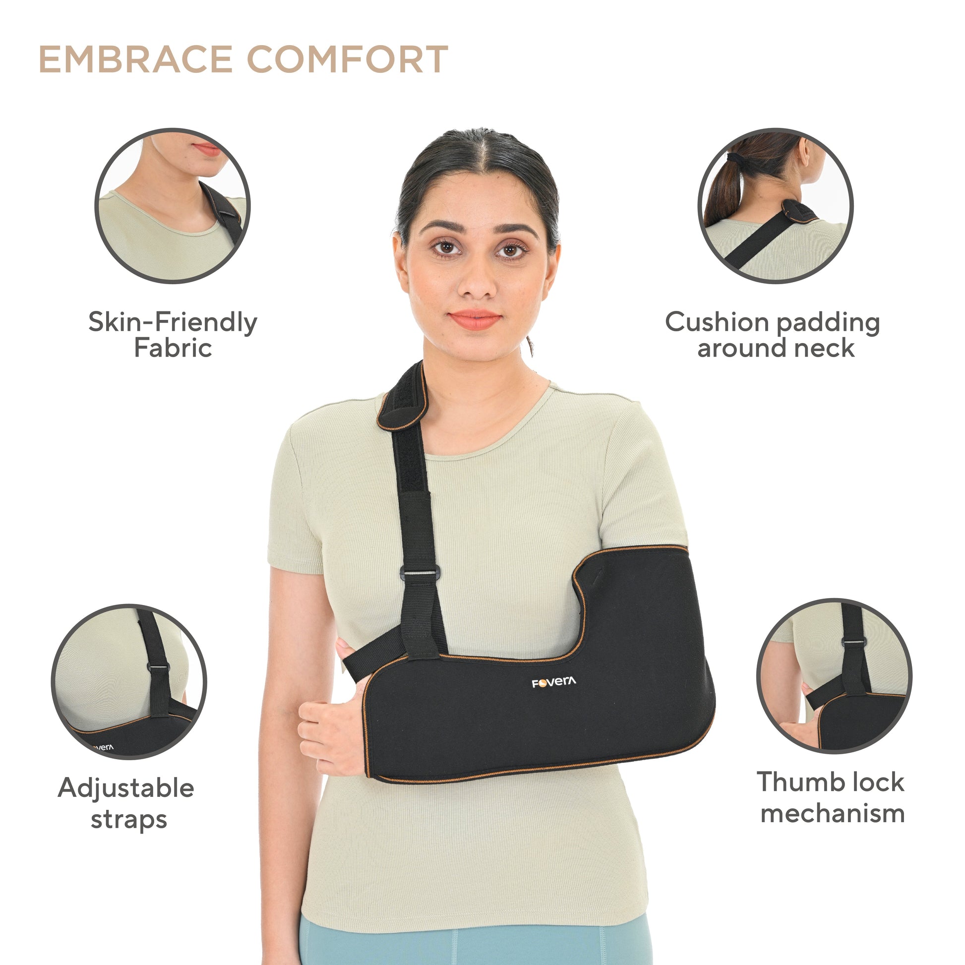 - HOW TO WEAR FOVERA ARM POUCH SLING: To wear the FOVERA Arm Pouch Sling, simply slide your arm into the sling and tighten and fasten the strap to a comfortable resting height and arm angle. The user-friendly design of the arm-sling ensures ease of use.
