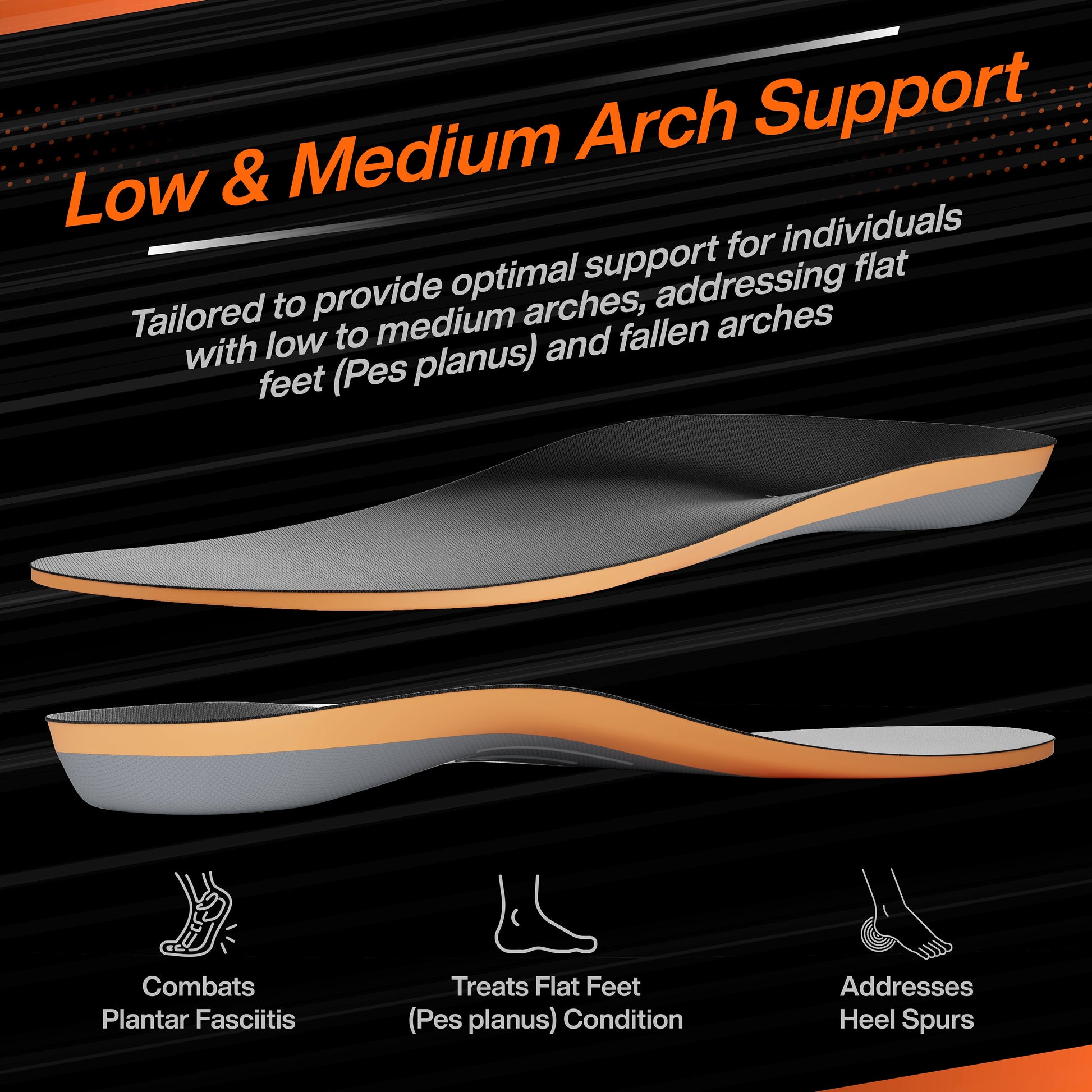 - LOW & MEDIUM ARCH SUPPORT: Enhance your comfort and alleviate foot pain with FOVERA Medium Arch Support Insoles. Designed specifically for flat feet (Pes planus), fallen arches, plantar fasciitis, and heel spurs, these insoles provide optimal support to the midfoot, promoting a natural and balanced foot alignment.