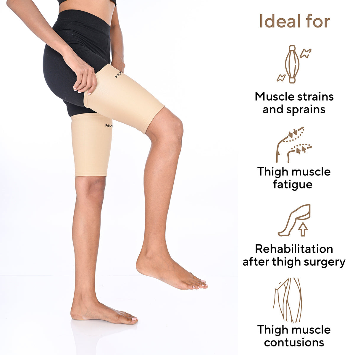 - INJURY PREVENTION AND RECOVERY: The FOVERA Thigh Support Sleeve is not only ideal for active individuals but also for those in the process of recovering from thigh-related injuries, strains, or sprains. The compression and targeted support aid in faster recovery and help prevent re-injury, allowing you to get back on your feet sooner.